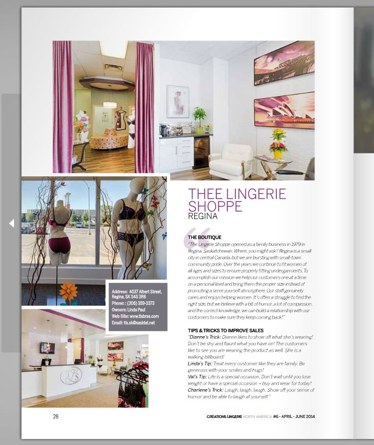 Thee Lingerie Shoppe was recently written up in the October issue of Créations Lingerie North America. Click this link to read the issue.